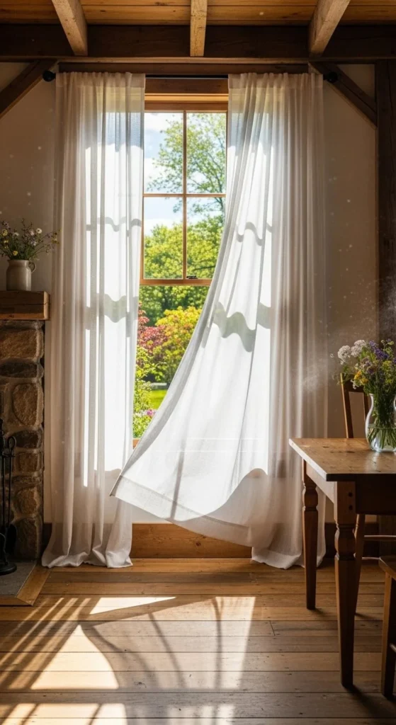 Swap heavy curtains for sheer panels. Light moves better and makes rooms feel open.