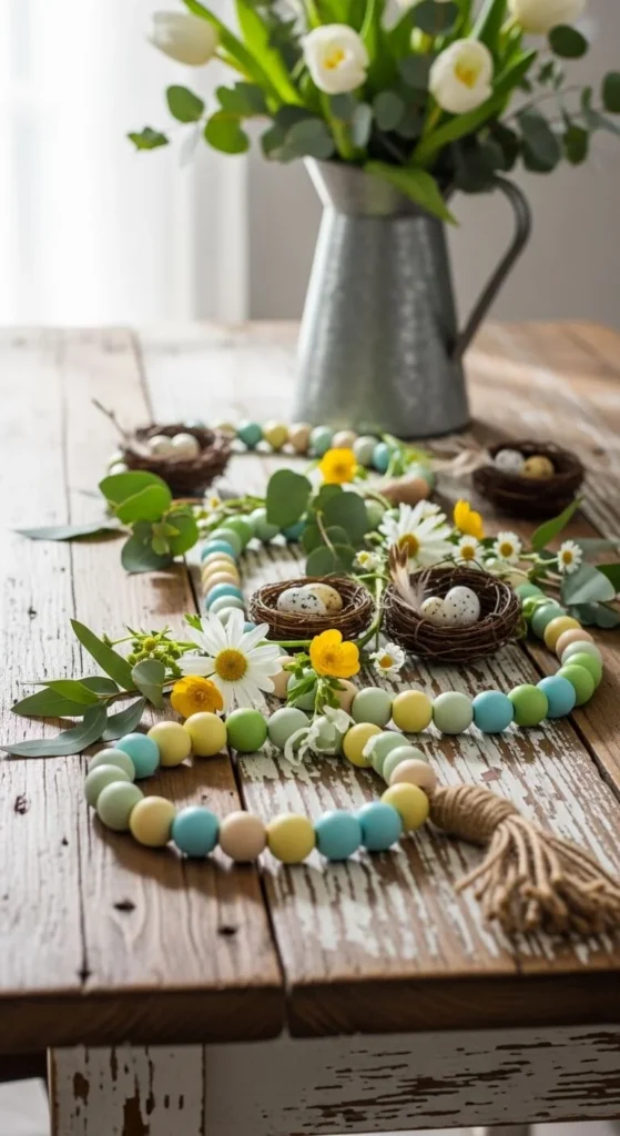Drape bead garlands loosely on trays or shelves. Wood adds warmth without bulk.