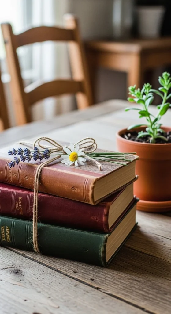 Use worn books for texture. Stack them or lean them. Neutral covers work best.