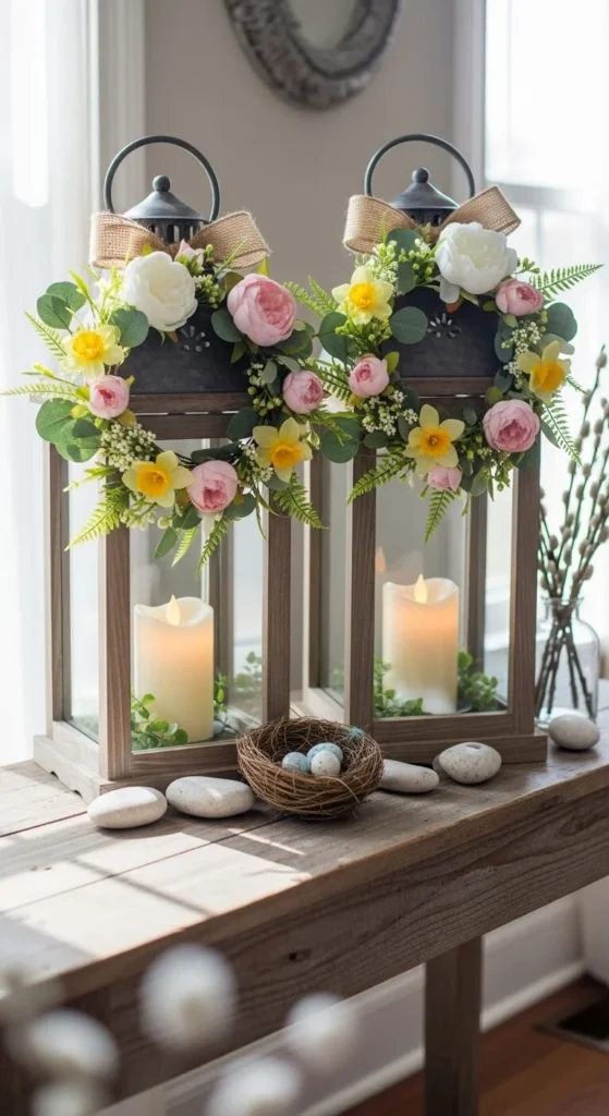 Lanterns add height and warmth. Leave them empty or add greenery inside.