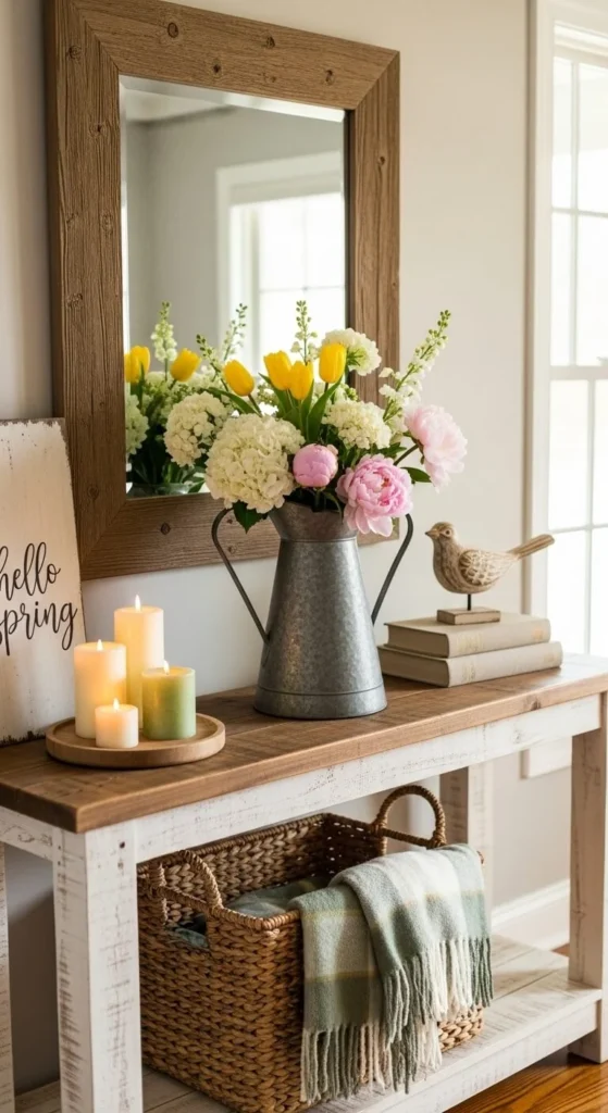 Use a mirror, small plant, and tray. Keep spacing open. Entryways set the tone.