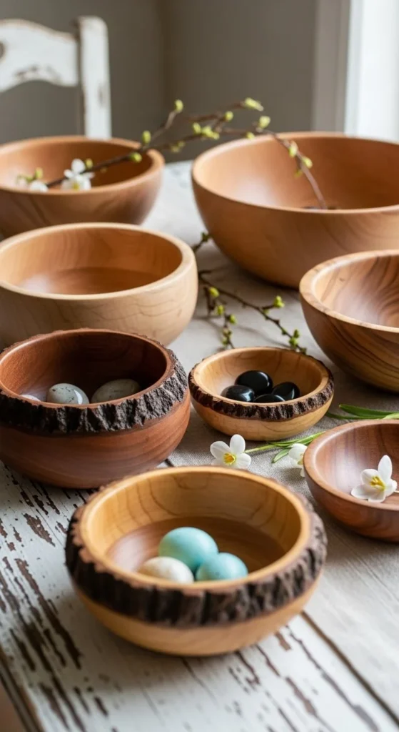 Wood bowls add character. Leave them empty or fill lightly with greenery.
