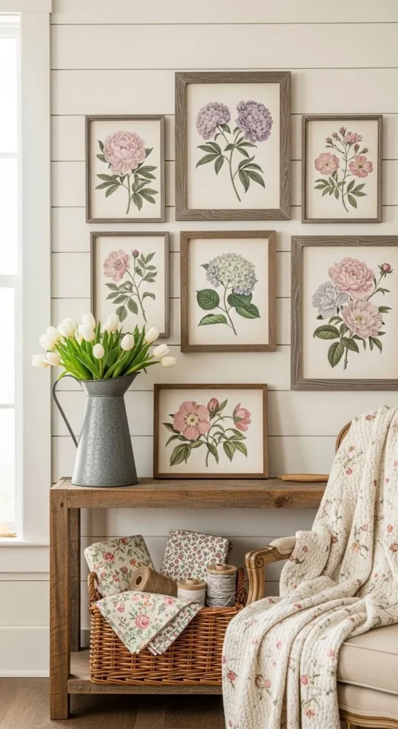 Choose faded or sketch-style florals. Avoid bold colors. Keep frames simple.