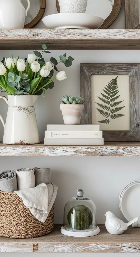 Limit items on open shelves. Use ceramics, wood, and greenery. Space matters. Fewer pieces help the shelf feel calm.