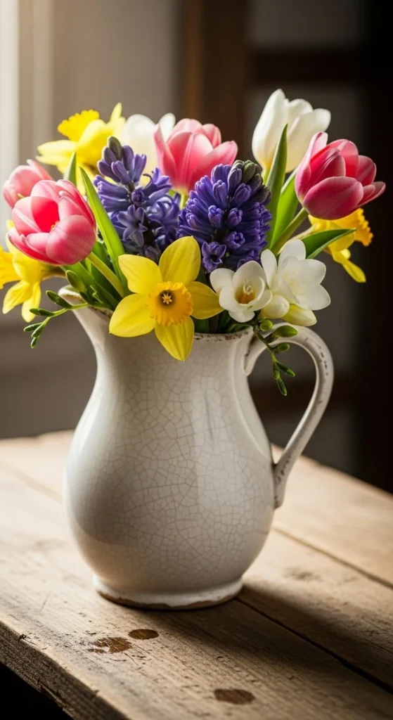 Use an old metal or ceramic pitcher. Fill with loose flowers. Let stems fall naturally. This feels casual and welcoming.