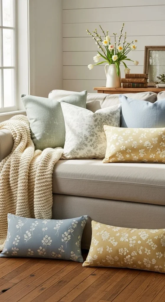 Swap dark pillows for lighter covers. Stick to simple patterns or solids. Texture matters more than color here.