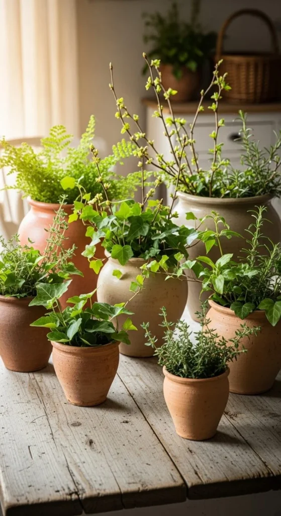 Clay pots feel earthy and grounded. Add herbs or faux greenery. Keep pots unpainted for a rustic look.