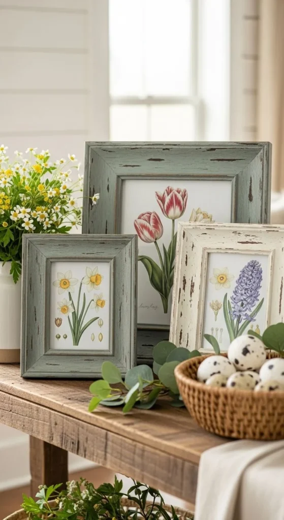 Use frames with worn finishes. Keep artwork simple. Lean frames instead of hanging for a relaxed feel.
