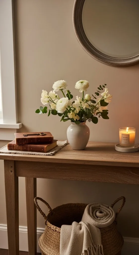 A simple floral arrangement near the front door sets the mood right away. Choose light-colored flowers like white, blush, or pale yellow. Keep the vase small so it doesn’t block keys or mail. A clear glass or plain ceramic vase works best. Trim stems short for a clean look. You don’t need a full bouquet. Even three or four stems feel enough. If fresh flowers stretch the budget, mix real greenery with one or two faux blooms. Rotate the flowers weekly to keep it feeling current. Avoid patterned vases here. Let the flowers speak on their own. This small detail makes the entry feel welcoming without feeling staged or crowded.