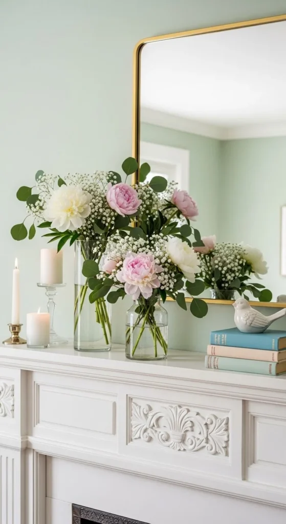 Use one central floral piece or spaced small vases. Keep symmetry loose. Avoid heavy colors. This keeps the mantel feeling balanced.