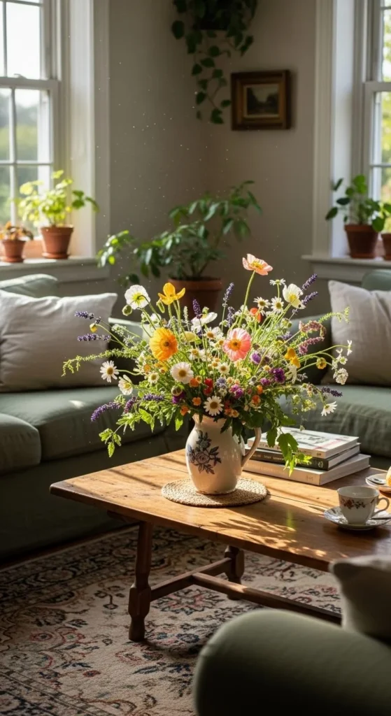 Loose, natural arrangements feel relaxed. Mix different stem heights. Avoid tight bunches. This style feels easy and lived-in.
