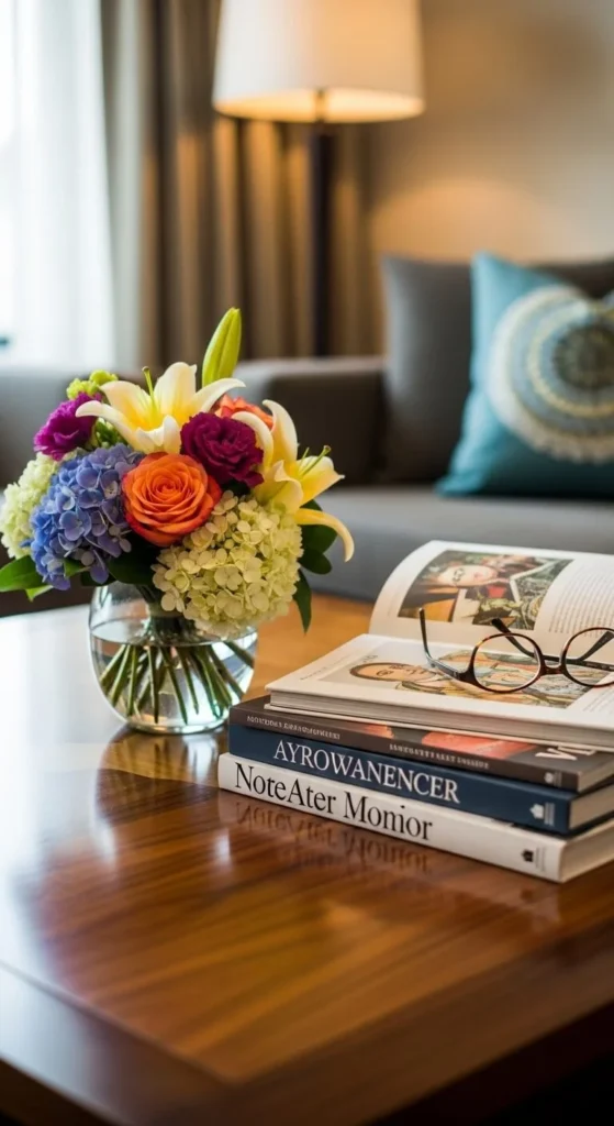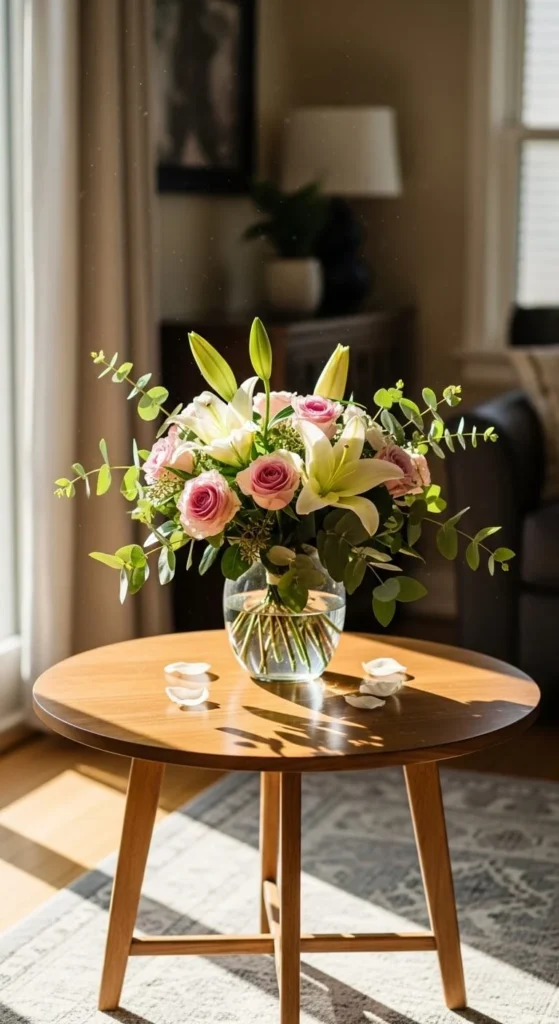 Use one small arrangement on the coffee table. Keep it low and centered. Pair it with books or a tray. Avoid large bouquets here. This keeps the table useful and easy to move around.