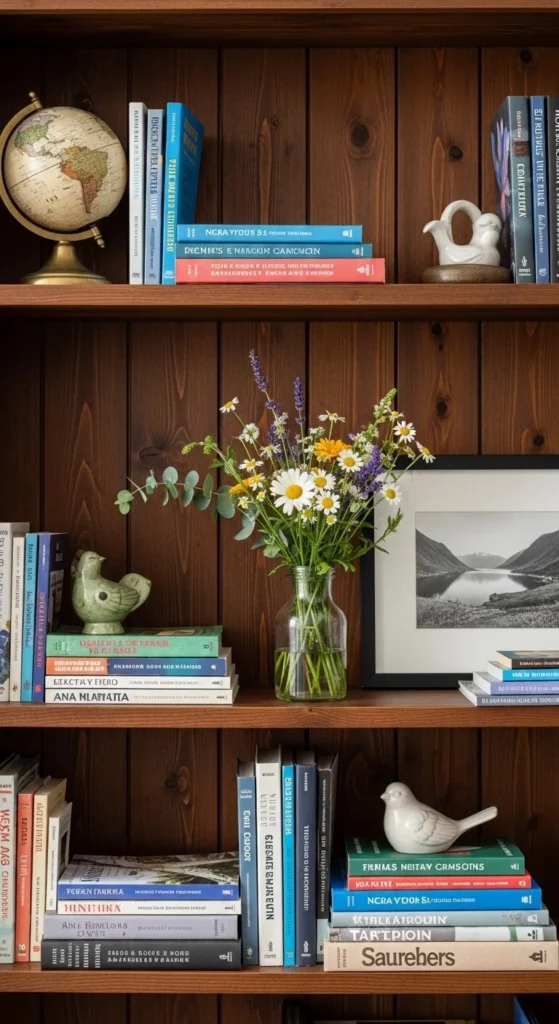 Use flowers as breaks between books. Keep stems short. This adds softness without crowding shelves.