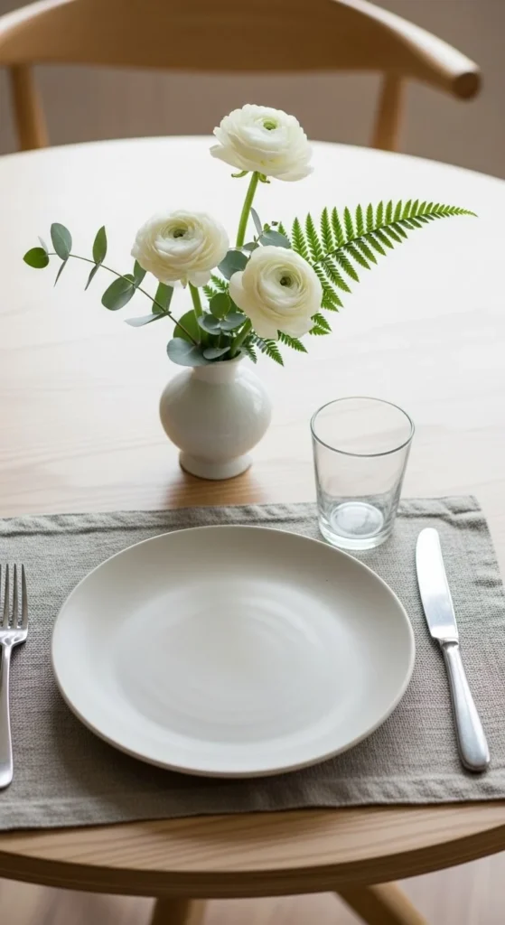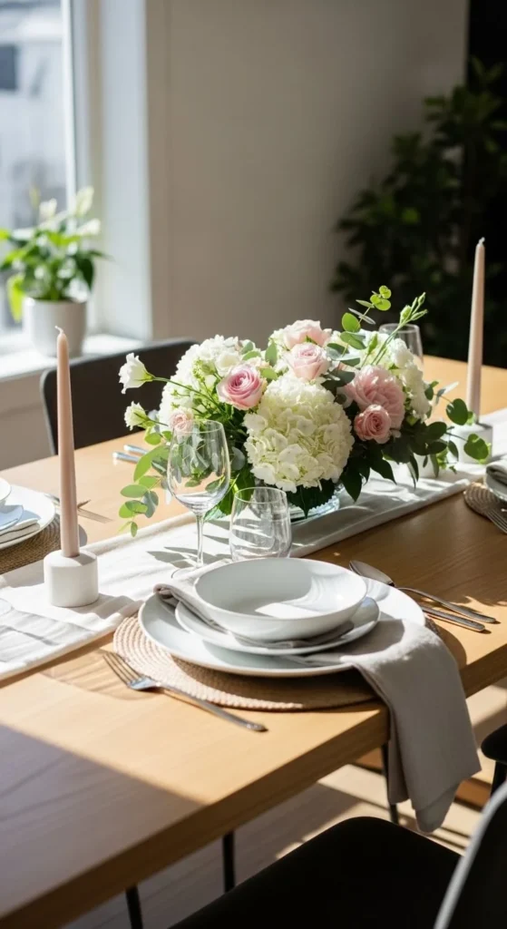 Use a low arrangement so everyone can see across the table. A shallow bowl or short vase works well. Mix flowers with greenery to keep it relaxed. Skip heavy tablecloths. Let the flowers sit on bare wood or a simple runner. This setup works for daily meals, not just guests.