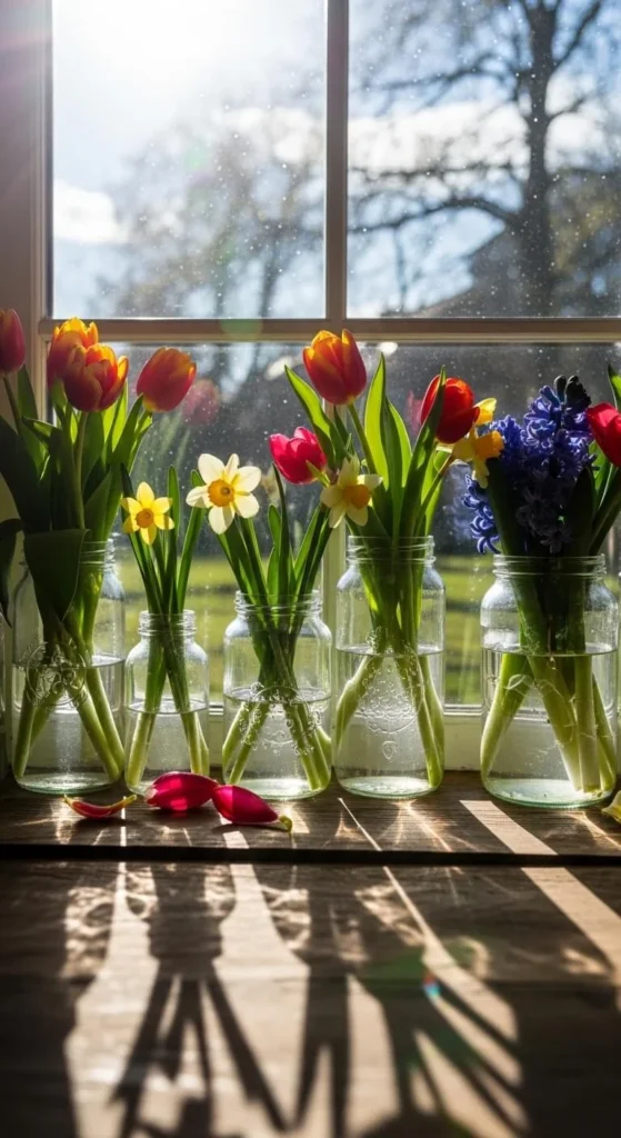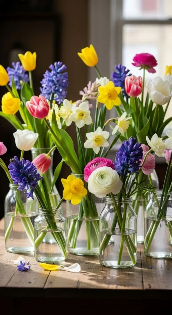 Reuse glass jars as casual vases. Line them along a window sill for a soft spring look. Keep each jar simple. This works well in kitchens or home offices. Change water often to keep them fresh.
