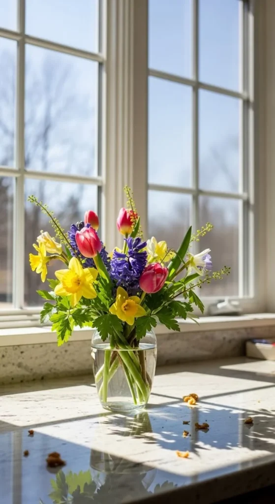 A small vase on the kitchen counter adds life without getting in the way. Place it near a window or corner. Choose flowers that don’t drop petals quickly. Keep stems short and water clean. This adds warmth to everyday routines like cooking or morning coffee. Avoid bold colors here. Soft greens and whites feel calm in busy kitchens.