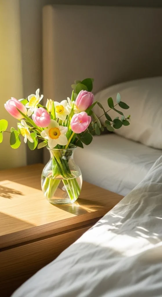 A tiny floral accent by the bed feels calm and personal. Choose gentle colors and simple flowers. Keep the vase narrow so it doesn’t crowd lamps or books. This adds softness to the room without changing the whole space. Swap flowers weekly for variety.