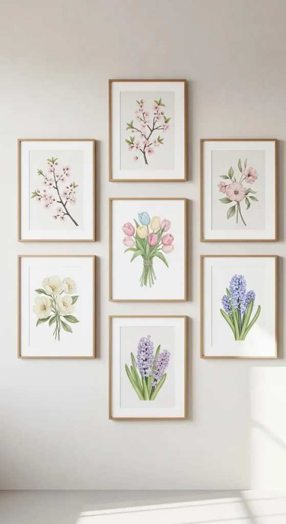 Floral art adds a lasting spring feel. Choose prints with soft colors and open space. Simple frames keep it grounded. This works well when fresh flowers aren’t practical.