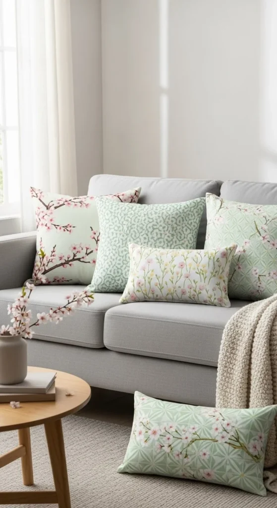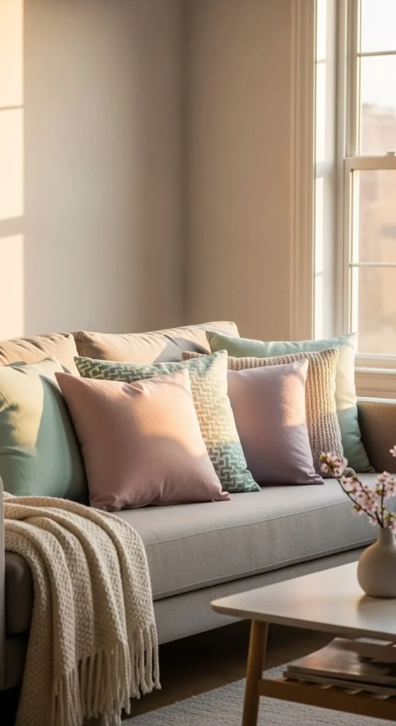 Mix soft colors with what you already own. Neutral couches pair well with gentle tones. If your sofa already has color, choose lighter shades of the same family. Pillow covers are usually cheaper than full pillows and easy to store later. This small update brings a spring feel without changing furniture or layout.
