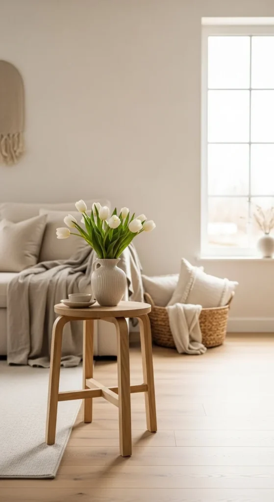 Light wood brings warmth without feeling heavy. A small stool, tray, or picture frame adds texture. These pieces work well in many styles.