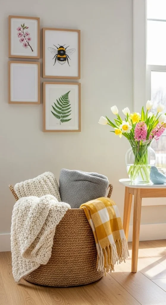 Baskets add texture and storage. Use them for throws or magazines. Natural materials feel right for spring.