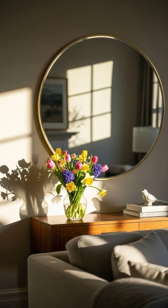 Mirrors help spread natural light. A simple mirror across from a window brightens the room. Choose thin frames or light finishes.