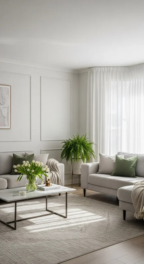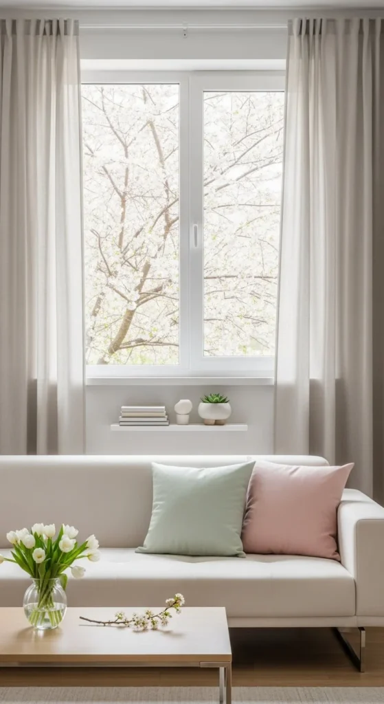 Spring decor works best with lighter palettes. Whites, creams, and soft pastels reflect light. Limit dark colors to small accents.