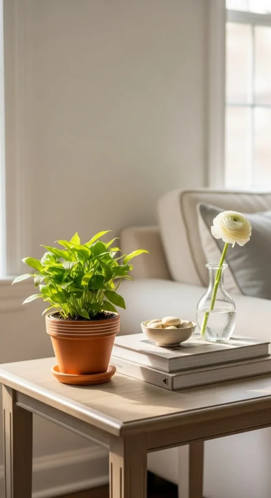 Plants make any room feel alive. A small potted plant on a side table adds color and warmth. Choose low-care options like pothos or snake plants. If real plants are not an option, realistic faux plants work well too.