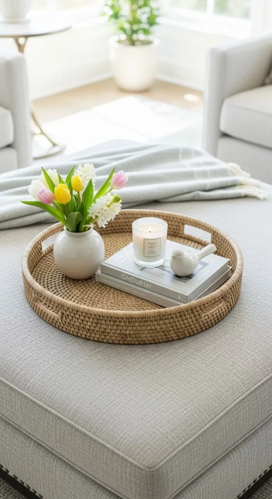 You can use items you already have. Even a shallow basket works as a tray. This setup makes the coffee table feel tidy and intentional. It also allows quick changes later by swapping small items.