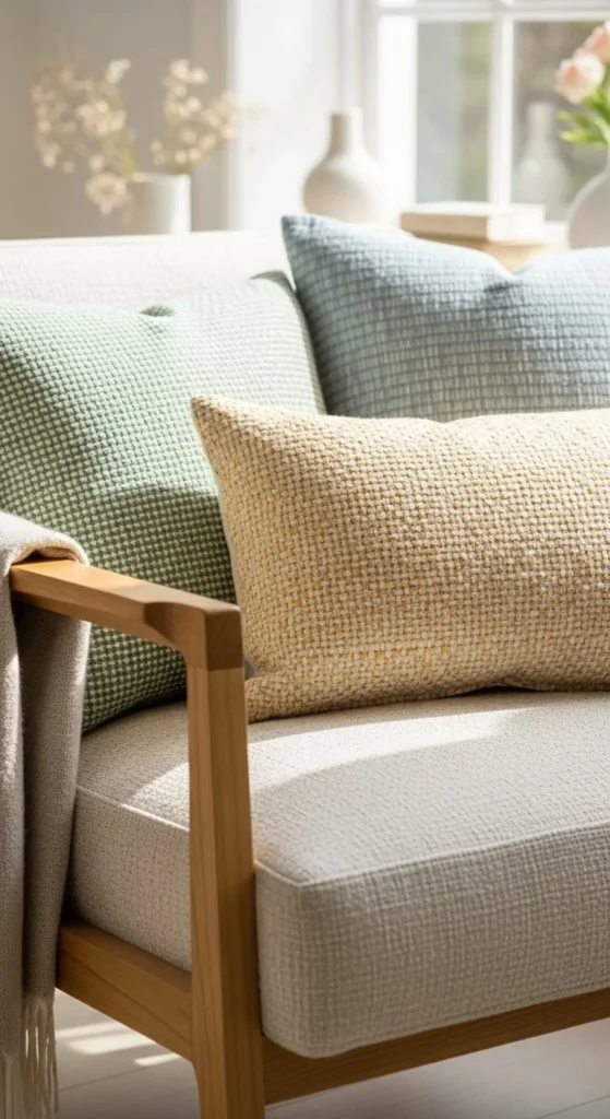 Throw pillows are one of the easiest ways to refresh a living room. Pastel shades like blush, light green, or pale blue instantly lighten the space. You do not have to replace every pillow. Even two new covers can shift the mood. Look for cotton or linen fabrics for a relaxed feel. Thrift stores often have solid-color pillows that work well with simple covers.