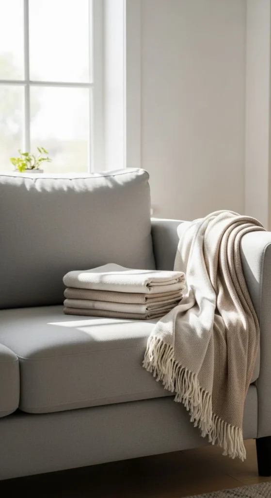 Lightweight throws still add comfort during cool evenings. They also help soften the room visually. You can find affordable throws at discount stores or reuse scarves as decorative layers. This simple change makes the living room feel open and season-ready.