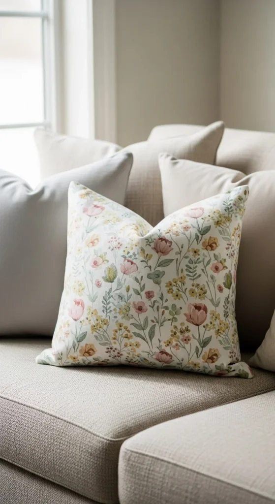 Floral patterns bring spring indoors without much effort. One or two floral pillows are enough. Choose small prints in soft colors to keep the look calm. Pair them with solid pillows so the room does not feel busy.