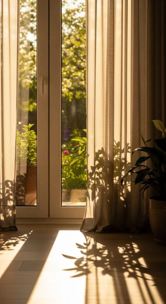 Dark curtains can block light and feel heavy. Sheer or light-colored curtains let sunlight fill the room. White, cream, or soft beige fabrics work well. Even changing just the outer panels can make a difference.