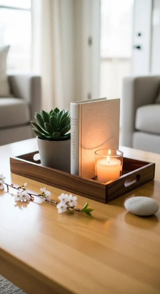 A tray helps organize small items while adding style. Use a wooden or white tray as a base. Add a small plant, a candle, and one book. Keep it minimal and balanced.