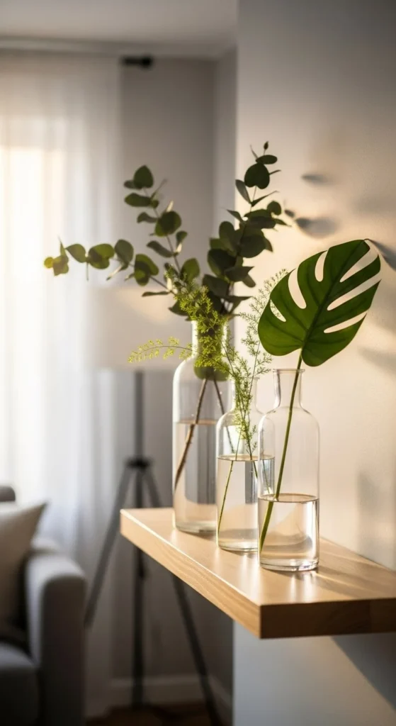 Clear glass vases feel light and clean. Fill them with fresh branches, simple flowers, or even greenery from outdoors. The transparency keeps the look airy.