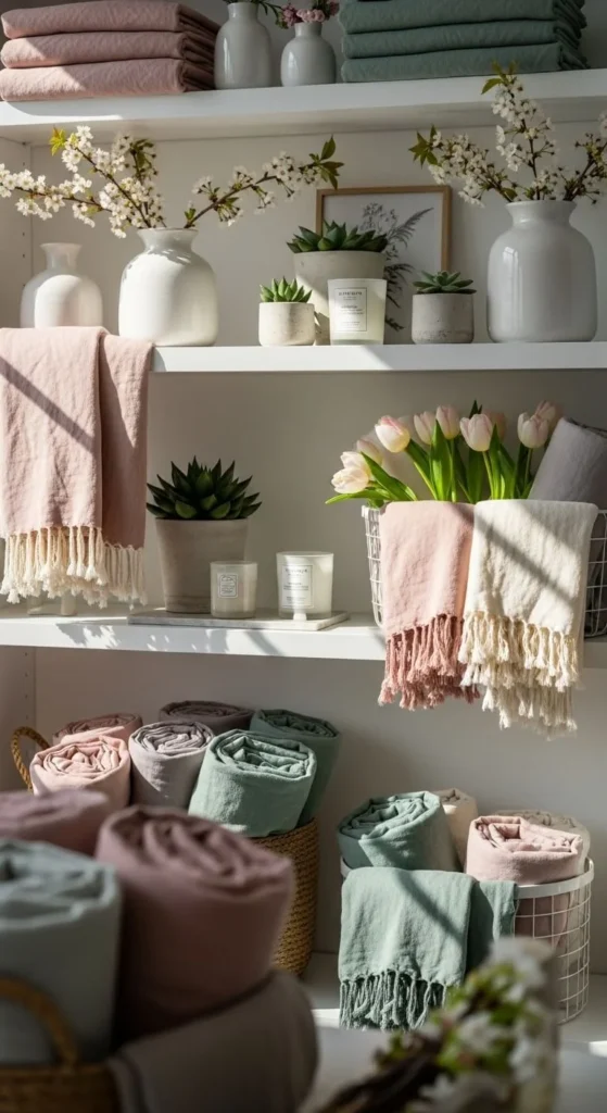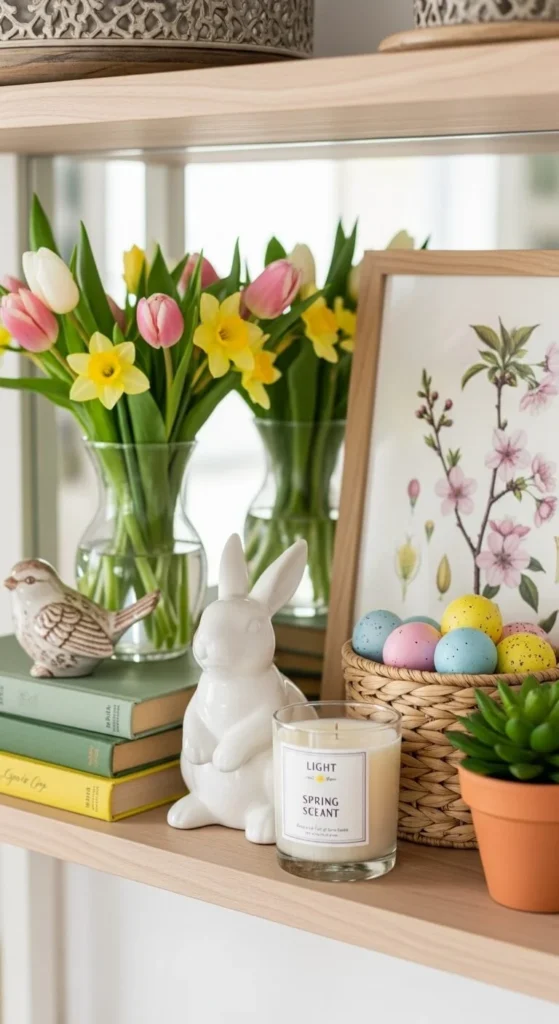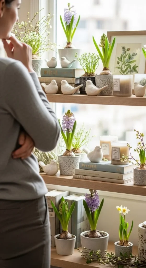 Store extra decor elsewhere. Rotate pieces instead of stacking them all out. This keeps shelves fresh.
