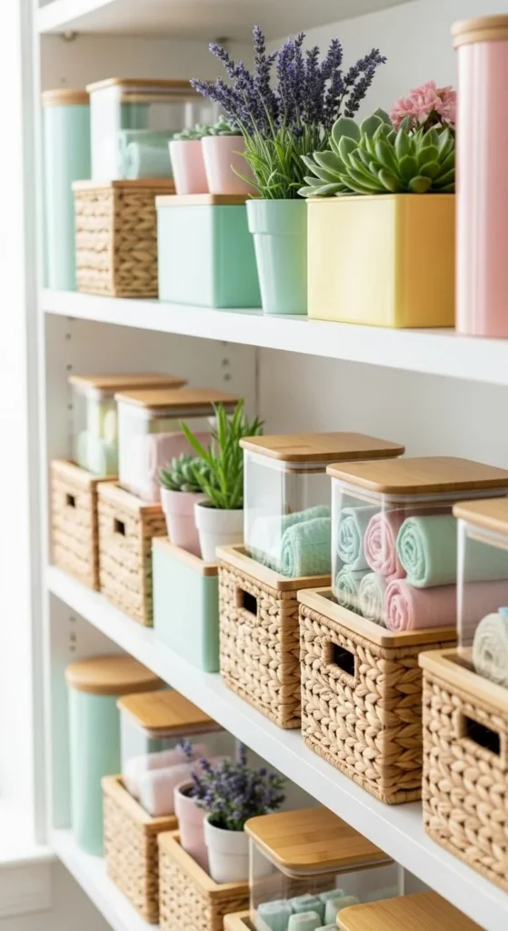 Matching boxes or baskets reduce visual clutter. They hide small items while keeping shelves tidy.