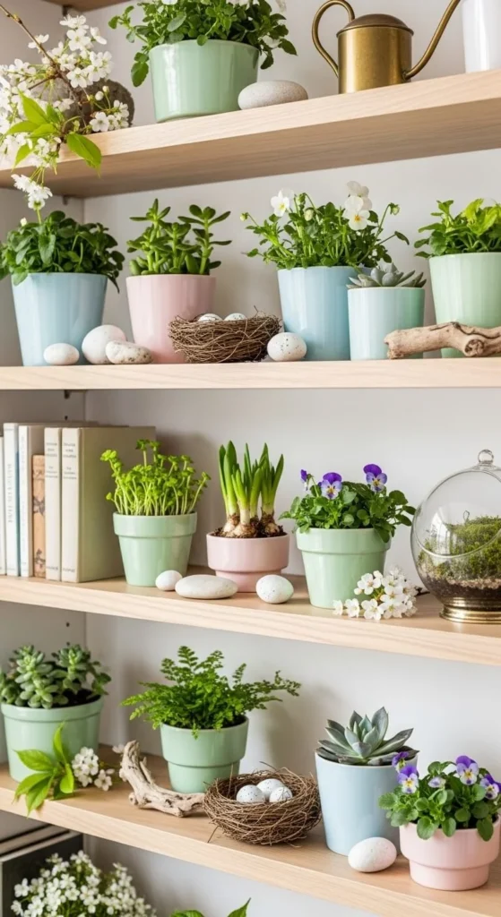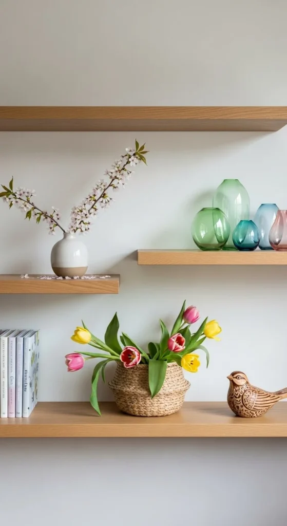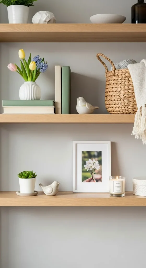 Spring shelves look best when they feel calm and intentional. Too many items make shelves feel heavy fast. Too few can feel unfinished. The goal is balance. With spacing, repetition, and simple materials, shelves can feel styled without feeling busy. These ideas focus on clear steps, affordable pieces, and easy swaps so your shelves feel thoughtful, light, and easy to live with.