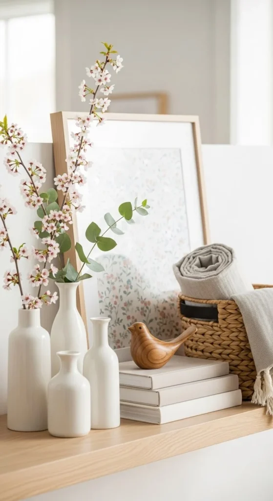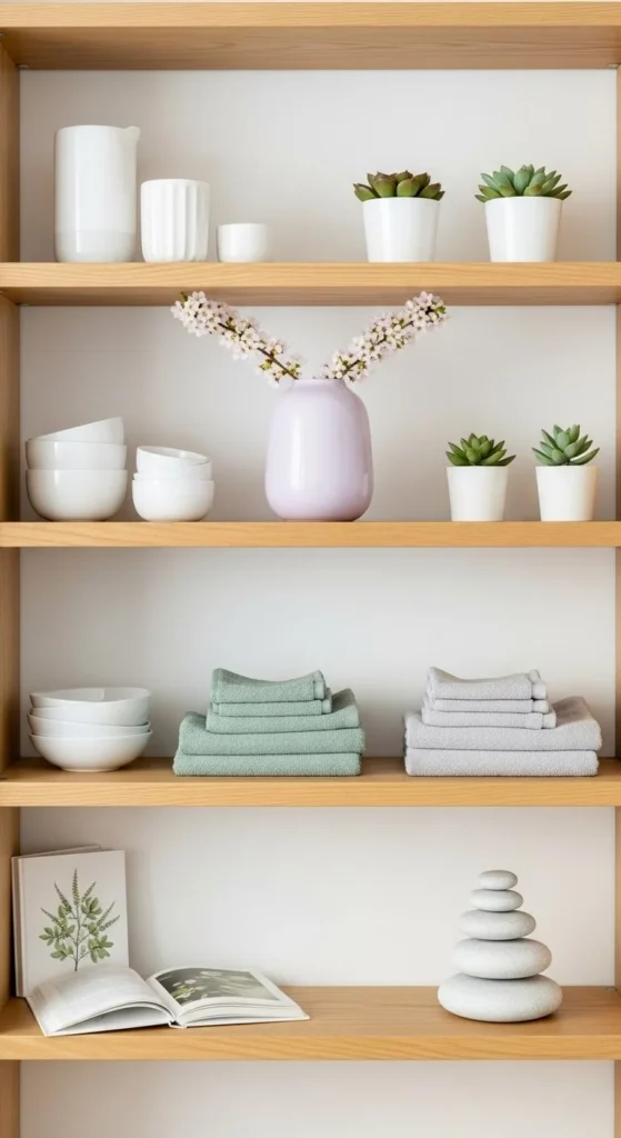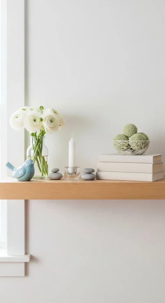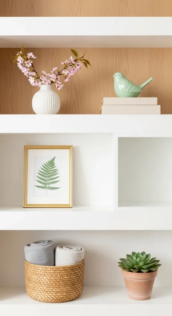 Choose two main colors and one accent. Soft whites, light wood, and muted greens work well. This keeps the shelf calm. If an item feels loud, remove it. Color control matters more than item count.