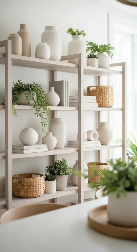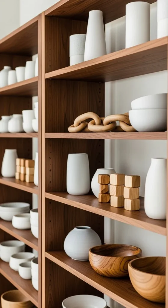 Repeat wood, ceramic, or glass across shelves. This connects the look. Repetition feels planned and calm.