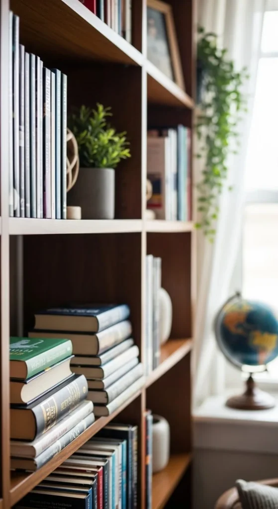 Stand some books upright. Stack others flat. This breaks repetition. Place a small object on stacked books for balance.