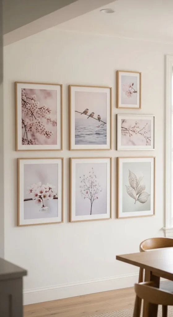 Nature-inspired prints bring calm energy to blank walls. Choose images of leaves, flowers, or outdoor scenes in soft tones. Light wood or white frames keep the look airy.