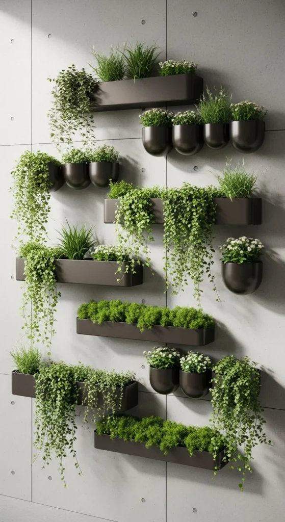 Wall planters bring greenery up off surfaces. Use trailing plants for movement.