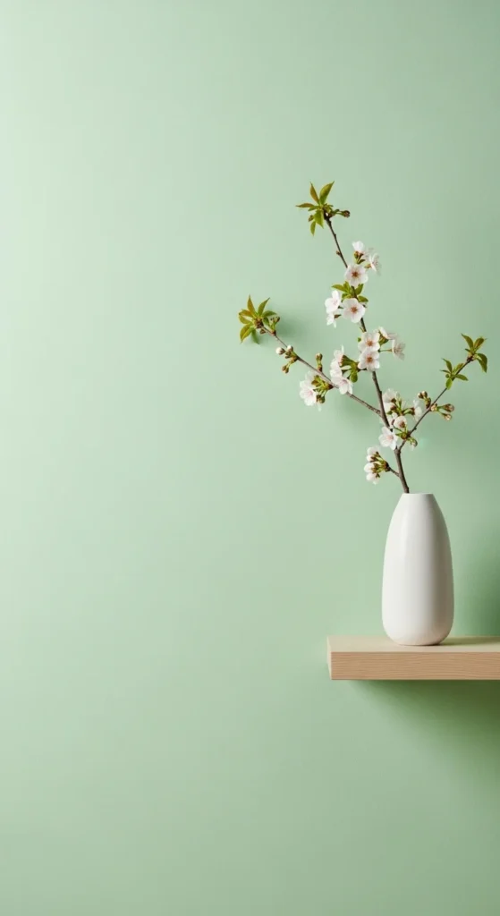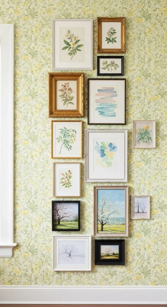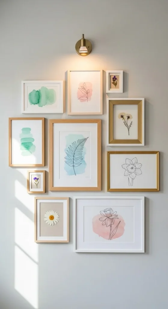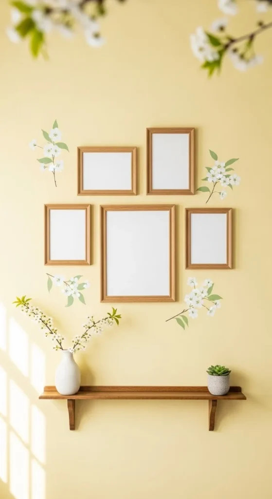 Light wood or white shelves work best for spring. Shelves allow easy changes later without repainting or rehanging art.