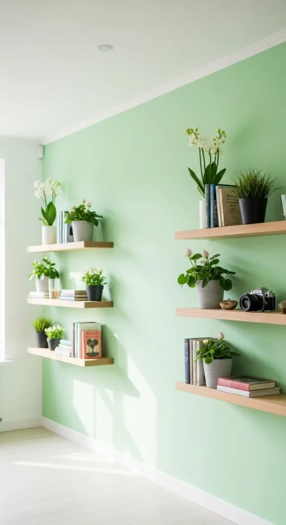 Floating shelves add both style and function. Use them to display small plants, books, or vases. Keep items spaced out so the wall does not feel crowded.
