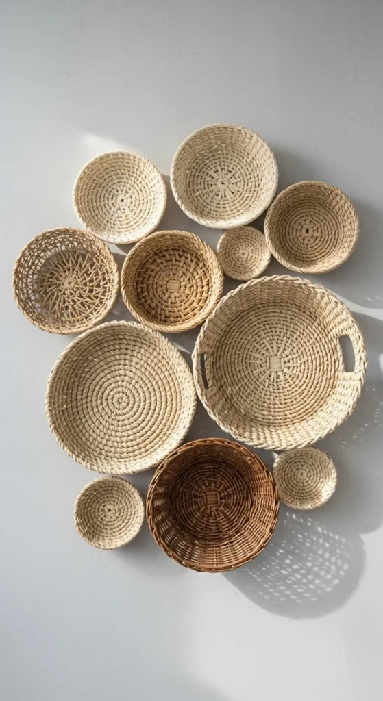 Woven baskets add texture and warmth. Hang two or three in a loose pattern. Natural materials fit well with spring decor.