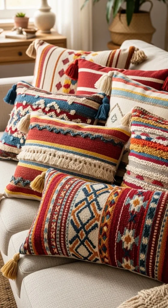 Texture adds depth even when the color palette stays simple. Handwoven pillows create a cozy, layered feel.
