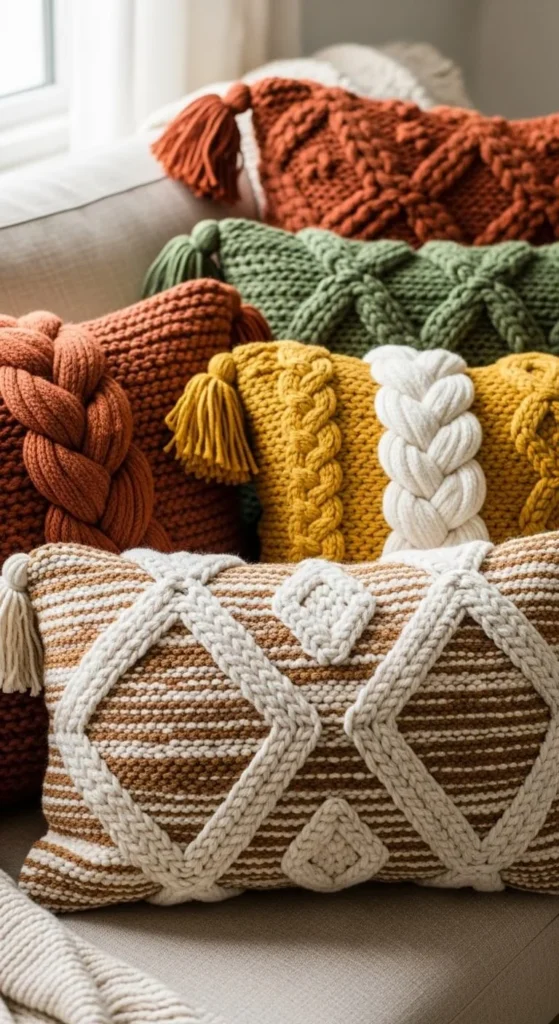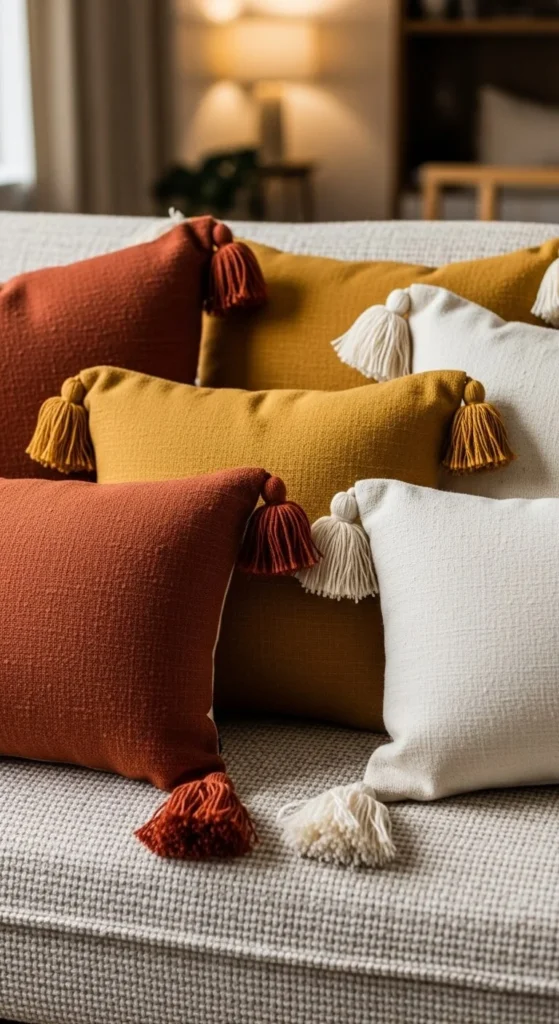 Look for pillows in warm shades like rust, mustard, or cream.