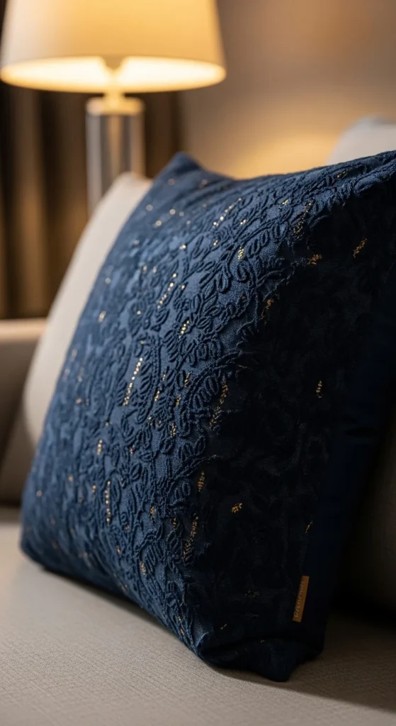 Deep blue pillows with small gold details feel polished and stylish.