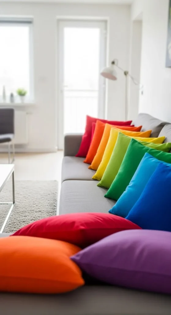 Choose pillows in different shades like red, orange, yellow, green, and blue.